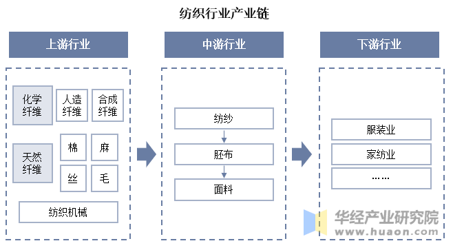 从纺织行业财产链来看,纺织业的上逛次要是原材料,包罗化学纤维、天然纤维等;中逛是纺织行业的加工及制制环节;下逛则是次要面向服拆业、家用纺织品业等范畴。