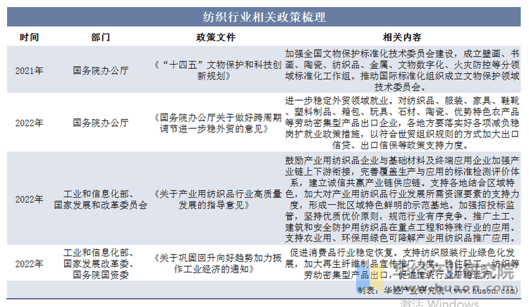 本文节选自华经财产研究院发布的《2022年中国纺织行业现状及趋向阐发,如需获取全文内容,可进入华经谍报网搜刮查看。政策方面,国务院办公厅、工业和消息化部、国度成长委和国务院国资委正在纺织行业关出台了系列政策。次要是成立健全文物范畴多条理尺度系统,成立纺织品等分范畴尺度化工做组。曲击招工难和用工贵问题,对纺织品、服拆等劳动稠密型产物出口企业,落实各项减负、扩就业的办法。支撑纺织服拆行业绿色化成长,加强财产链上下逛跟尾。