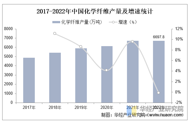 纺织行业做为劳动稠密型财产,其财产链间的联系关系度较大,化学纤维做为纺织行业上逛端的次要是原材料之一,能够通过加工织形成为多种纺织产物。2022年的化学纤维产量为6697。8万吨,较上岁尾下降0。2%。