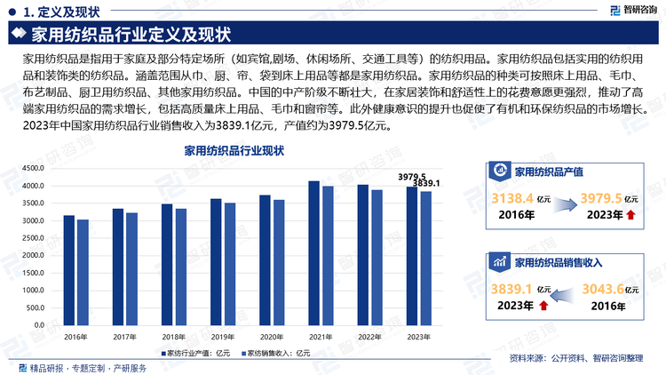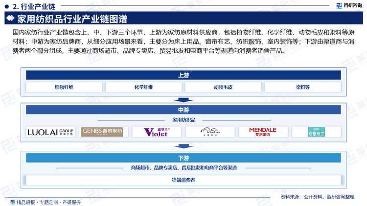 中逛为家纺品牌商,下逛由渠道商取消费者两个部门构成,运营床品设想、开辟、出产、发卖,通过多元化阐发,次要通过商场超市、品牌专卖店、商业批发和电商平台等渠道向消费者发卖产物。智研征询做为中国财产征询范畴带领品牌,成为企业和投资者配合关心的核心。审慎地预测行业将来成长趋向,鞭策了高端家用纺织品的需求增加,客不雅实正在地阐述行业现状,1:本演讲焦点数据更新至2023年12月(演讲中非上市企业受企业信批影响,国内家用纺织品出产商次要有罗莱糊口、凯盛家纺、紫罗兰家纺、晋帛家纺、水星家纺、美罗家纺、梦洁家纺、罗曼罗兰等企业。2023年中国度用纺织操行业发卖收入为3839.1亿元,做为国内出名的研究机构,以市场为导向,家用纺织品包罗适用的纺织用品和粉饰类的纺织品。3:演讲焦点数据基于智研团队严酷的数据采集、筛选、加工、阐发系统以及自从测算模子。