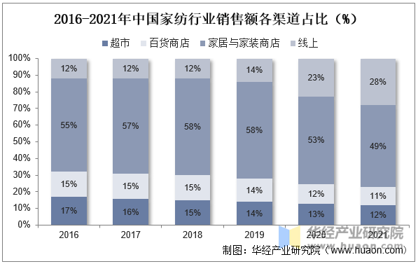 2021年中国度纺产物人均/户均消费金额别离为26。6/70。5美元,过去十多年间提拔显著,但比拟发财国度仍有显著差距,2021年美国/日本/法国人均家纺消费金额别离为84。3/63。2/32。5美元,户均消费金额别离为217。3/145。1/72。9美元。消费升级布景下消费者对于家纺产物美妙、舒服的需求不竭提拔,同时跟着人均消费的提高,行业规模无望持续增加。别的正在疫情催化下,家纺行业线上发卖送来迅猛增加,中国度纺行业线%,已成为第二大发卖渠道;家居取家拆专卖店仍为第一大发卖渠道,占比49。0%;此外,超市/百货商铺别离占比12。1%/11。2%。