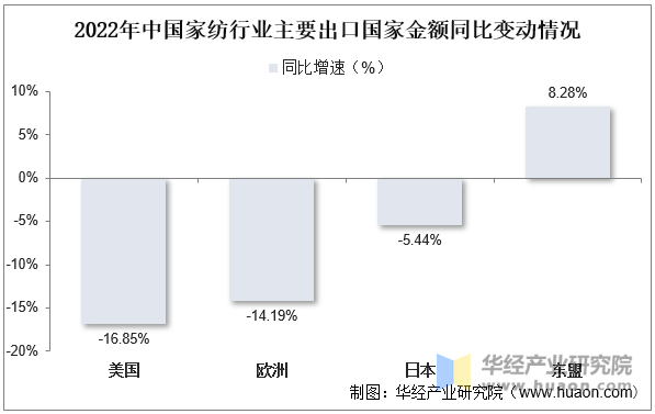 从次要出口市场看,美、欧、日等发财经济体成长疲态进一步。据数据显示,2022年我国对美、欧、日出口家纺产物同比别离下降16。85%、14。19%和5。44%;而新兴东盟市场总体连结不变增加。2022年我国对东盟市场出口家纺产物共计82亿美元,同比增加13%,此中数量同比增加8。28%,单价同比增加4。35%。