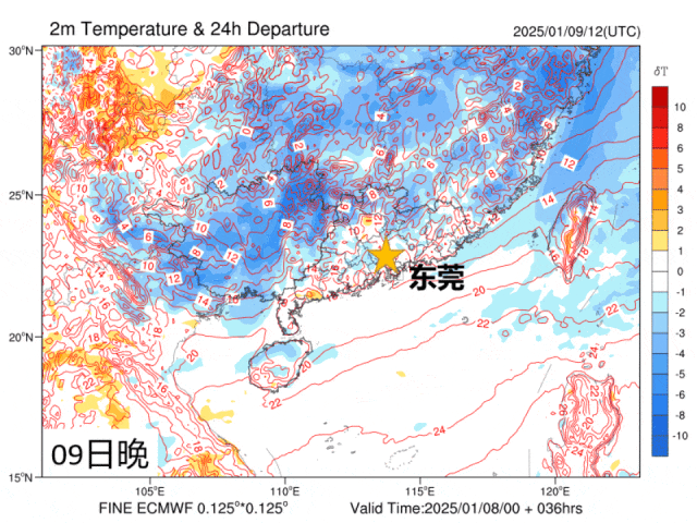 估计东莞市10-12日受冷空气影响,晴间多云,冬风加大,气温下降,此中11-12日晚上最低气温8-9℃;13-14日多云为从,气温回升;15-16日受新一轮冷空气影响,气温下降;瞻望17-18日以晴间多云为从,最高气温回升。