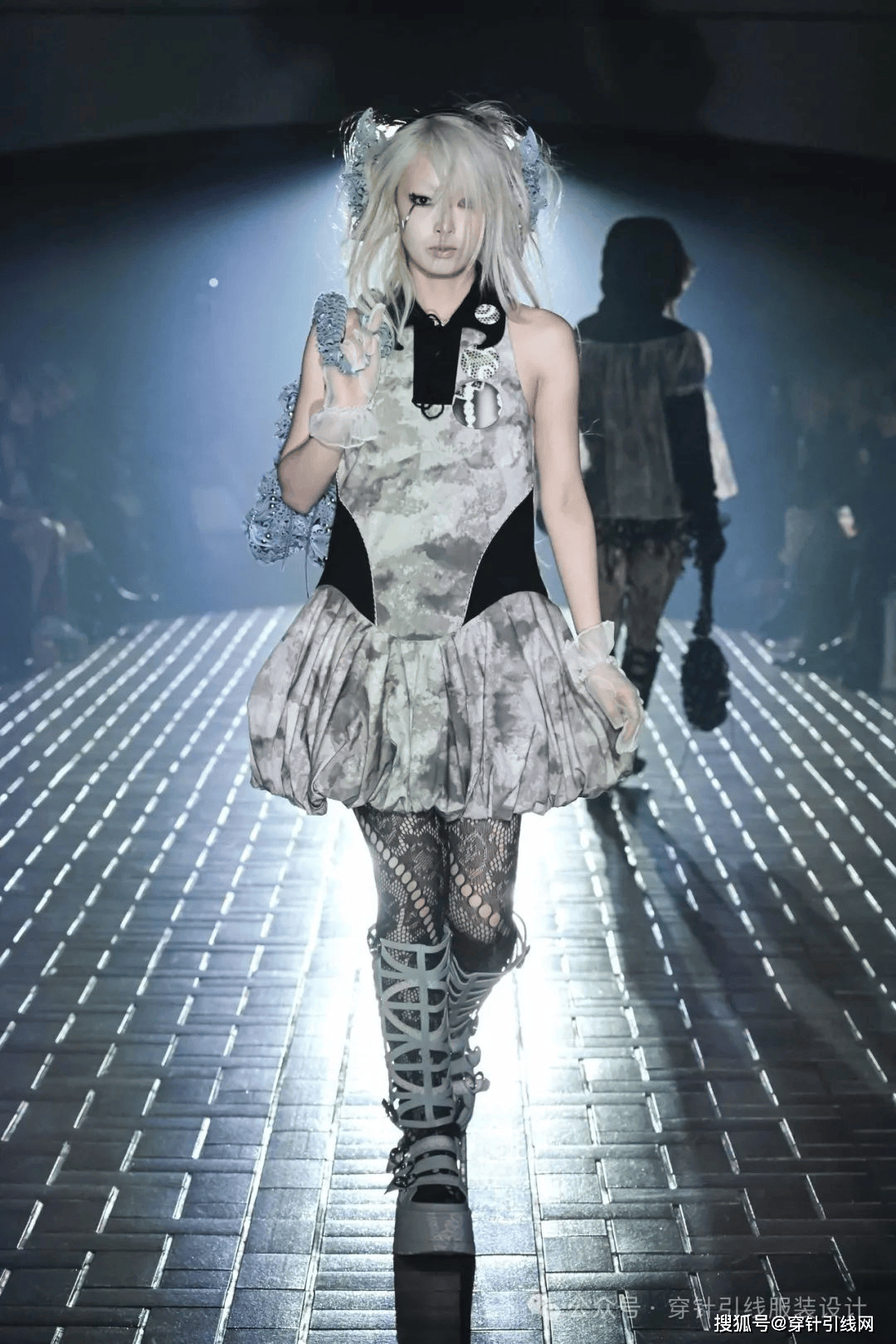 一踏入秀场,便能感遭到哥特取维多利亚气概碰撞出的火花。维多利亚式的大氅严肃典雅,搭配哥特气概的配饰,奥秘而艰深。同时,将来从义元素强势介入,激光切割蕾丝镶边闪灼着科技感的寒光,仿佛来自遥远星际,取保守元素构成强烈反差,却又不测协调。
