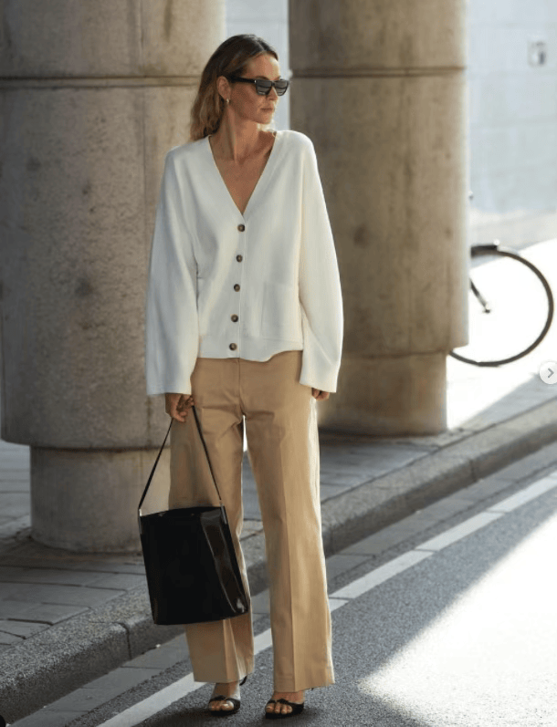 白色针织开衫取黑色阔腿裤的组合可以或许轻松打制出一种简约而不失高级感的时髦气概。