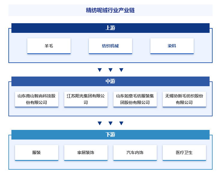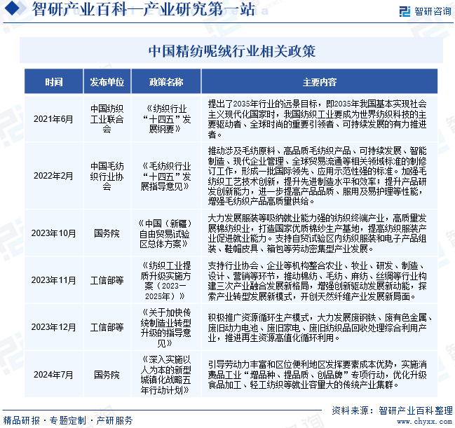我国对精纺呢绒行业采用宏不雅调控和行业自律相连系的监管体例。国度发改委是行业的宏不雅指点部分,相关职责包罗对全国工业和办事业成长进行宏不雅指点;组织订定需报国务院审批或跨多部分的工业和办事业专项规划并组织实施;组织订定分析性财产政策;按权限审核工业严沉扶植项目等。工业和消息化部是行业的行业办理部分,相关职责包罗订定行业规划和财产政策并组织实施;指点行业手艺律例和行业尺度的订定;按国务院权限,审批、核准国度规划内和年度打算规模内固定资产投资项目;行业日常运转监测等。中国纺织工业结合会(CNTAC)是行业的自律组织,以棉纺织、毛纺织、麻纺织、丝绸、针织、长丝织制、印染、家用纺织、财产用纺织、服拆、化纤、纺机十二个财产办事为工做核心,充实阐扬各单元分析协调感化,积极开展行业办事工做。精纺呢绒为纺织服拆财产细分范畴,我国纺织服拆行业次要法令律例次要表现为纺织产物的国度尺度和规范。近年来,我国出台一系列行业政策,持续激励纺织企业科技立异、产物立异以及结构智能制制、绿色制制,利好具有立异和智能化实力的专业化运营企业,加快裁减行业内数量浩繁的定位于低端产物的粗放成长的企业,进一步提拔财产集中度。同时,跟着内需的持续增加和国际市场份额的稳步上升,我国毛纺工业市场布局不竭调整,国内市场的主要性不竭提拔,国度相关部分出台《纺织工业提质升级实施方案(2023—2025年)》《中国(新疆)商业试验区总体方案》等政策,从出口导向逐渐转向国表里市场并沉,企业也愈加注沉向出产办事型成长,向价值链中高端延长,由规模成长型向质量效益型改变。
