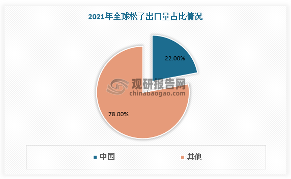 我国是松子次要产出国,也是次要出口国。性价比高,深受俄罗斯、美国及其他欧洲国度欢送。2021年我国松子出口量占全球松子出口量的比沉为22%。