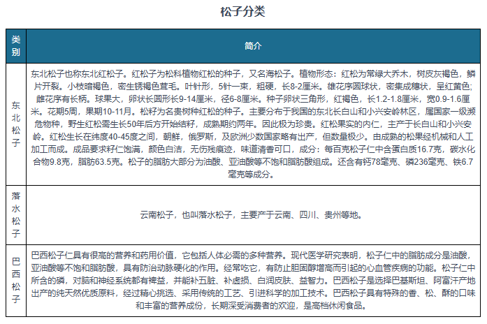 按照不雅研演讲网发布的《中国松子行业成长深度阐发取投资前景研究演讲(2024-2031年)》显示,我国松子以初加工为从,松仁占领绝大大都市场。借帮高科技研发手艺,目前市场上曾经呈现了很多松子深加工产物,如松子酒、松子油、松子固体饮料等。松子深加工产物附加价值较高,行业成长前景较好,无望成为松子行业新的增加点。