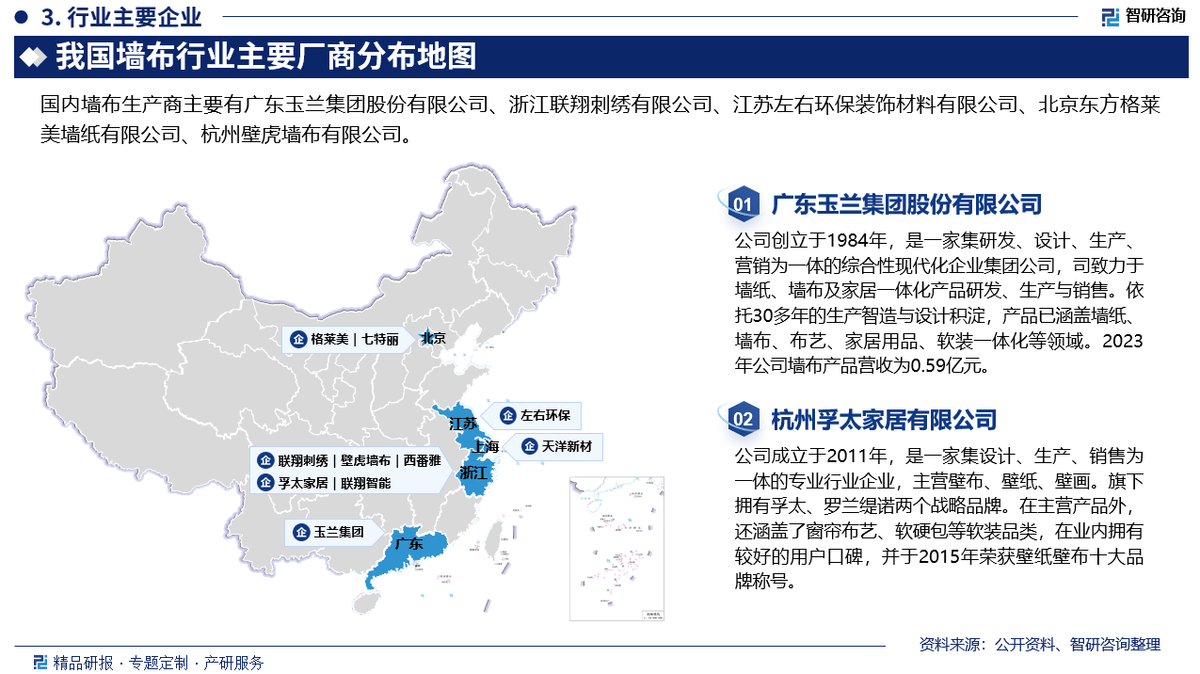 目前,墙布制制企业次要集中正在保守纺织业发财的江浙地域,全体市场较为分离,大都企业规模偏小,自从研发设想能力较弱,产质量量参差不齐。因为墙布墙纸初期小规模加工制制的投资规模要求相对较低,处置墙纸墙布制制的企业数量浩繁,企业的产物同质化较为严沉,部门企业次要聚焦于产物的低价推广,而轻忽产物设想、质量节制、渠道扶植等方面,形成了市场内产质量量参差不齐。将来伴跟着出产规模和发卖收集的持续扩展,行业内龙头公司正在资金、品牌、项目办理等诸多方面劣势较着,正在墙面家拆市场中市场份额持续扩大。而龙头企业的做大做强有帮于行业规范化、尺度化成长,其品牌的持久也能提高墙布墙纸正在墙面加拆行业的影响力和全体合作力。