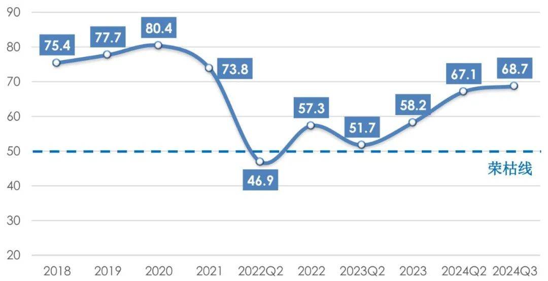 2024年前三季度,全球经济增加势头强劲,但通货膨缩压力、商业严重场面地步和投资趋紧等问题仍然存正在;我国经济运转总体稳中有进,高质量成长结实推进,向好要素累积增加。行业出口全体处于回暖区间。按照协会调研,2024年前三季度我国财产用纺织操行业景气指数为68。7,较上半年提拔1。6个百分点(图1)。