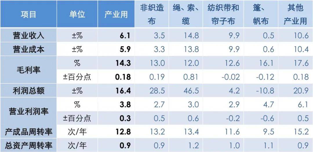 分范畴看,1-9月,非织制布规模以上企业的停业收入和利润总额别离同比增加3。5%和28。5%,停业利润率为2。7%,同比提高0。5个百分点;绳、索、缆规模以上企业的停业收入和利润总额别离同比增加14。8%和46。5%,增速均居行业首位,停业利润率为3%,同比添加0。6个百分点;纺织带、帘子布规模以上企业的停业收入和利润总额别离同比增加9。9%和4。2%,停业利润率为2。9%,同比降低0。2个百分点;篷、帆布规模以上企业的停业收入同比微增0。5%,利润总额同比下降10。8%,停业利润率为4。7%,同比下降0。6个百分点;过滤、土工用纺织品所正在的其他财产用纺织品规模以上企业的停业收入和利润总额别离同比增加10。6%和20。9%,6。1%的停业利润率为行业最高程度(表1)。