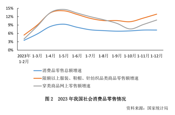 内销方面,随着国家一系列促销费政策的持续发力、线下消费场景逐步恢复、购物节等多种促销手段的推进激发消费热情,国内市场呈现回暖递进。2023年,全年国内生产总值超126万亿元,比上年增长5.2%。全年社会消费品零售总额约47万亿元,比上年增长7.2%,增幅较2022年提高7.4个百分点。其中,限额以上服装、鞋帽、针纺织品类商品零售额同比增长12.9%,实物商品网上穿类商品零售额同比增长10.8%。