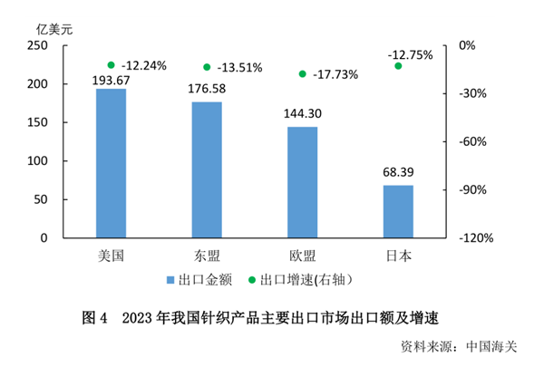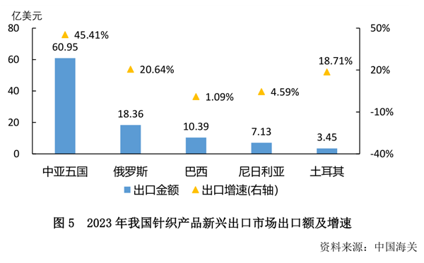 从出口市场来看,我国针织产品的出口结构持续调整,贸易市场呈多元化发展。2023年我国针织产品对美国、东盟、欧盟、日本出口同比分别下降12.24%、13.51%、17.73%和12.75%。同期我国对中亚、中东、俄罗斯等国家和地区出口表现良好。2023年我国针织产品对中亚五国出口同比增长45.41%;对俄罗斯出口同比增长20.64%;对土耳其出口同比增长18.71%。此外,对尼日利亚、喀麦隆、巴西等国家出口也实现较好增长。